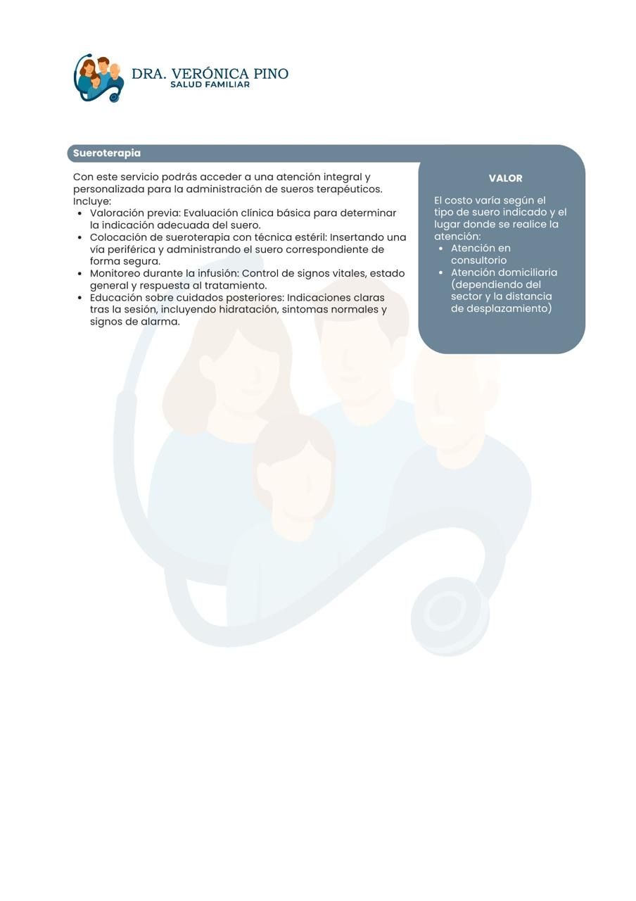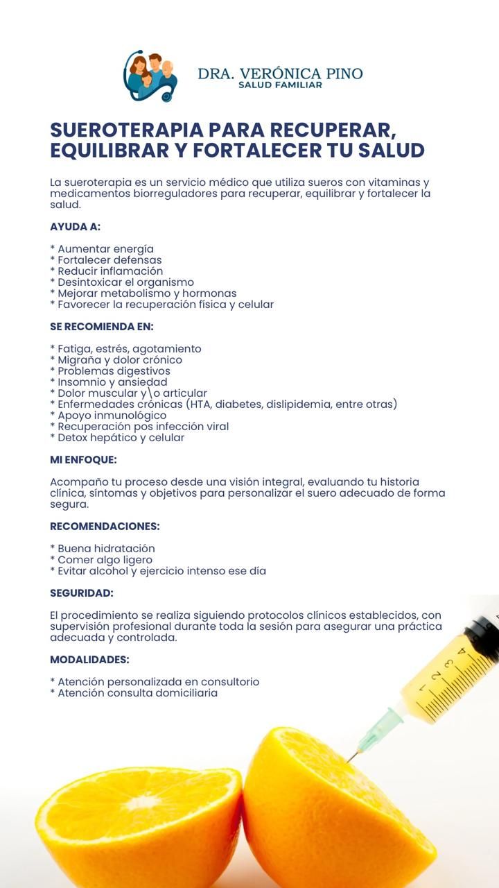 Aplicación de sueroterapia: Servicio médico que utiliza sueros con vitaminas y medicamentos biorreguladores para recuperar, equilibrar y fortalecer la salud.
